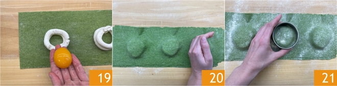 Das Eigelb in die Mitte geben 19. Mit einem anderen Blatt abdecken, gut verschließen, um die Luft herauszulassen 20. Schneiden Sie das Ravioli mit einem etwas breiteren runden Ausstecher aus (wir haben einen mit einem Durchmesser von 8 cm verwendet) 21.