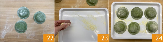 Sobald die Ravioli 22 geformt sind, legen Sie sie auf ein mit Hartweizengrieß bestreutes Tablett 23, gut verteilt, damit sie nicht kleben 24.