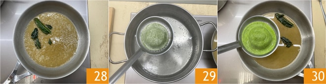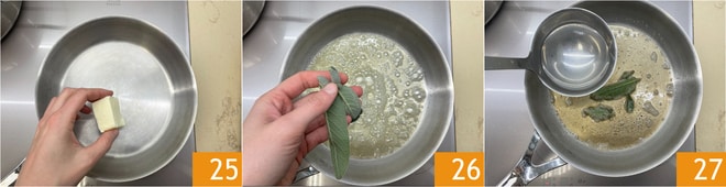 In einer Pfanne die Butter 25 schmelzen, den Salbei hinzufügen 26 und wenn es goldbraun ist, eine Kelle heißes Wasser 27 hineingeben.