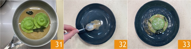 Einige Augenblicke durchziehen lassen, um den Geschmack zu intensivieren 31. Anrichten, indem Sie die Sauce auf dem Boden verteilen 32, dann das Raviolone und abschließend mit geriebenem Parmigiano Reggiano DOP bestreuen. Das grüne gefüllte Raviolone ist servierfertig 33.