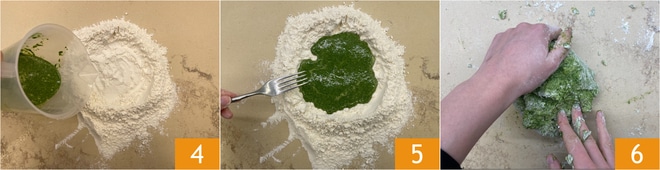 Die Mehlgrube auf der Arbeitsfläche formen, fast die gesamte Spinatcreme in die Mitte geben 4, ein wenig davon aufbewahren, um die Dosierung besser zu kalibrieren, je nachdem, wie das Mehl die Flüssigkeiten absorbiert. Zuerst mit einer Gabel mischen 5 und dann von Hand kneten 6.