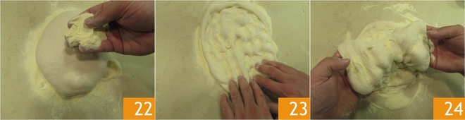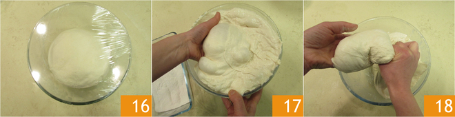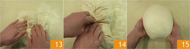 Bestäubt die Arbeitsfläche sparsam mit Pinsa-Mehl. Stürzt den Teig auf die Fläche und macht so genannte Faltungen: nehmt randweise den Teig und zieht ihn zur Mitte 13. Ihr werdet sehen, dass der Teig glatter wird 14. Dreht ihn dann um und formt eine Kugel, indem ihr über die Fläche rollt, um die Naht gut zu verschließen 15.