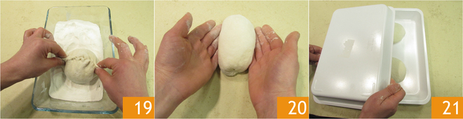 Legt jedes Teigstück mit der glatten Seite auf den Grieß, kneift die Naht jeder Portion zu 19. Dreht es dann auf eine Fläche mit der zugekniffenen Seite nach unten und dreht den Teig mit beiden Händen, um ihn gut zu verschließen 20. Legt das Brötchen auf ein Backblech mit der glatten Seite nach oben. Verfahrt so mit den restlichen Stücken und setzt sie mit ausreichend Abstand auf das Blech. Deckt mit einem zweiten Blech ab 21 und lasst sie 3–4 Stunden bei Raumtemperatur gehen, bis sie sich verdoppelt haben.