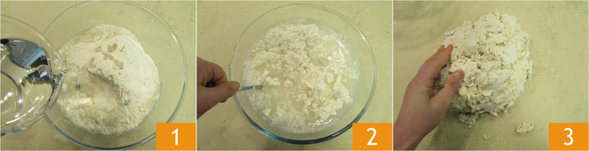 Um den Grundteig für Pinsa zuzubereiten, gebt ihr zuerst das Pinsa-Mehl und die zerbröselte frische Hefe in eine große Schüssel. Gebt auch 700 g kaltes Wasser aus dem Kühlschrank 1 hinzu und verrührt alles mit einem Löffel 2, bis das Wasser aufgenommen ist. Gebt den Teig auf die Arbeitsfläche und beginnt ohne zusätzliches Mehl zu kneten 3. Macht euch keine Sorgen, wenn die Masse am Anfang sehr grob ist.