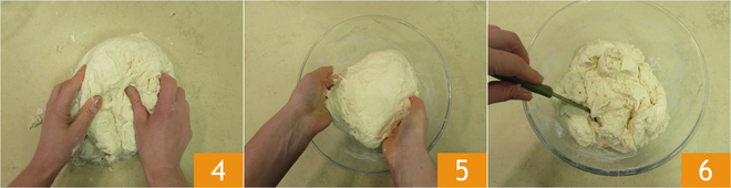 Knetet lange, bis eine glatte und kompakte Konsistenz erreicht ist 4. Gebt den Teig in eine Schüssel zurück 5 und macht mit einem Messer 3 Einschnitte 6: diese Aktion hilft, die später hinzuzufügenden Zutaten besser aufzunehmen.