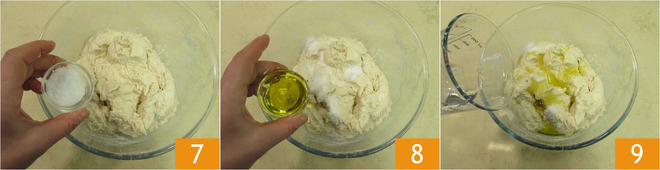 Gebt dann das Salz 7, das Öl 8 und die restlichen 50 g kaltes Wasser dazu; dieses fügt ihr nach und nach hinzu 9, während ihr weiterknetet.