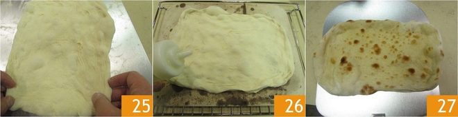 Nach der Gehzeit nehmt ein Brötchen und setzt es auf eine Arbeitsfläche, die reichlich mit Grieß bestreut ist. Bestäubt auch die Oberfläche mit Grieß 22. Beginnt am euch nächsten Rand und drückt den Teig mit den Fingern leicht nach oben, um ihn flachzudrücken. Drückt dabei die Finger fast parallel zur Arbeitsfläche, damit die Luft gleichmäßig verteilt wird 23. Formt ihn möglichst rechteckig bis oval. Hebt den Teig dabei vorsichtig an und entfernt überschüssigen Grieß 24.