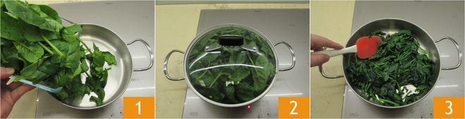 Um die grünen Spaghetti alla Chitarra mit Pecorino und Pfeffer vorzubereiten, beginnen Sie mit dem Teig: Waschen Sie den Spinat und geben Sie ihn in eine Pfanne 1, decken Sie ihn ab 2 und lassen Sie ihn etwa 5 Minuten lang oder so lange wie nötig weich werden 3.