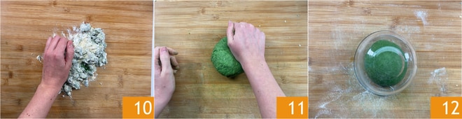 Übertragen Sie den Teig auf eine Arbeitsfläche 10 und kneten Sie ihn kräftig etwa 10 Minuten lang 11, bis Sie einen homogenen und glatten Teig erhalten. Formen Sie einen Teigballen, decken Sie ihn mit der Schüssel ab und lassen Sie ihn 30 Minuten ruhen 12.