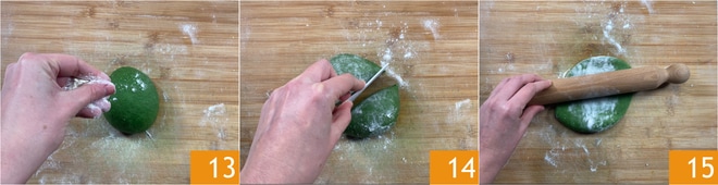 Nehmen Sie den Teigballen und legen Sie ihn auf die bemehlte Arbeitsfläche 13, nehmen Sie ein Drittel davon mit einem Teigschaber oder einem Messer 14. Lassen Sie den restlichen Teig abgedeckt, damit er nicht austrocknet. Rollen Sie den Teigballen mit einem Nudelholz aus 15.
