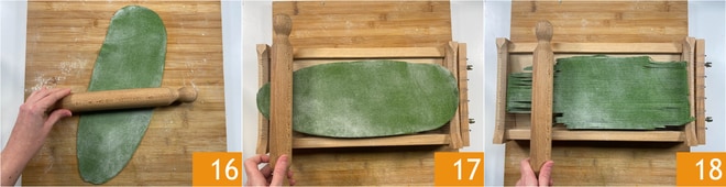 Sie müssen ein rechteckiges Teigblatt mit einer Dicke von 2 mm 16 erhalten. Versuchen Sie, ein Rechteck zu formen, das den Abmessungen Ihrer Chitarra entspricht. Heben Sie nun den Teig auf, indem Sie ihn um das Nudelholz wickeln, und rollen Sie ihn auf der Chitarra aus 17. Rollen Sie das Nudelholz fest über den Teig, um das Teigblatt mit den Saiten zu schneiden und die typischen Spaghetti zu erhalten 18. Verfahren Sie so mit dem restlichen Teig.