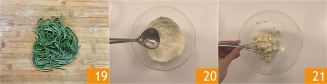 Formen Sie ein Nest mit den Spaghetti alla Chitarra, indem Sie sie leicht bemehlen, und halten Sie sie bei Raumtemperatur bereit 19. Inzwischen bringen Sie das Wasser zum Kochen, um die Spaghetti zu kochen. Bereiten Sie nun die Pecorino-und-Pfeffer-Sauce vor: Geben Sie den sehr fein geriebenen Pecorino Romano in eine Schüssel, fügen Sie eine Kelle Nudelkochwasser hinzu 20 und mischen Sie kräftig mit einem Schneebesen 21 oder einem Spatel. Sie müssen eine pastöse und trockene, aber glatte und klumpenfreie Konsistenz erhalten. Kochen Sie nun die Spaghetti in kochendem Wasser 2-3 Minuten lang.