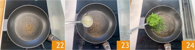 Mahlen Sie nun den schwarzen Pfeffer in einer Pfanne und rösten Sie ihn kurz, um seine Aromen und Düfte zu intensivieren 22. Geben Sie eine Kelle Nudelkochwasser hinzu 23 und lassen Sie die Spaghetti darin abtropfen 24.