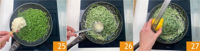 Lassen Sie die Pasta noch eine Minute lang weiter köcheln, schalten Sie dann die Hitze aus und fügen Sie die Pecorino-Paste hinzu 25. Passen Sie die Konsistenz mit einer Kelle Nudelkochwasser an und mischen Sie 26. Beenden Sie das Gericht mit geriebener Zitronenschale 27.