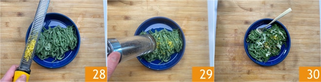 Servieren Sie die grünen Spaghetti alla Chitarra mit Pecorino und Pfeffer, indem Sie die Teller nach Belieben mit weiterer Zitronenschale 28 und gemahlenem schwarzen Pfeffer 29 garnieren. Genießen Sie sie heiß und cremig 30!