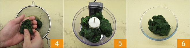 Drücken Sie den Spinat gut aus, indem Sie ihn in ein Sieb drücken 4, geben Sie ihn dann in den Mixer 5 und hacken Sie ihn 6. Stellen Sie ihn beiseite, Sie benötigen 200 g gehackten Spinat.