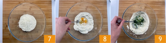 Geben Sie das Mehl 7 und die Eier 8 in eine Schüssel und mischen Sie sie dann mit einer Gabel, um die Zutaten zu verbinden 9.