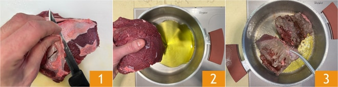 Um die Rinderbacke mit Artischocken zuzubereiten, bereiten Sie zuerst die Fleischbrühe nach unserem Rezept zu und halten Sie sie warm. Reinigen Sie das Fleisch, indem Sie die Haut entfernen 1. Geben Sie einen Schuss Öl in einen Topf, fügen Sie das Fleisch hinzu 2 und braten Sie es bei hoher Hitze für etwa 2 Minuten pro Seite an.