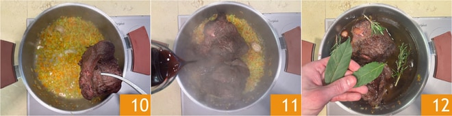 Legen Sie das Fleisch erneut in den Topf 10, bedecken Sie es mit dem restlichen Wein (etwa ein Liter) 11 und bringen Sie es zum Kochen. Fügen Sie nun den Rosmarin und das Lorbeerblatt hinzu 12.