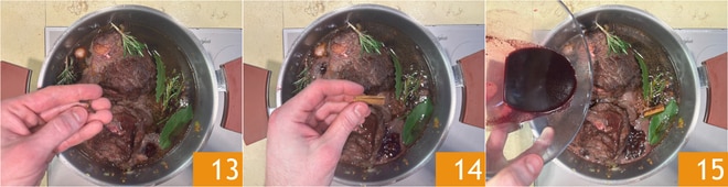 Aromatisieren Sie auch mit den Nelken 13, Wacholderbeeren und, wenn gewünscht, einem Zimtstängel 14. Zum Schluss gießen Sie den Wein hinzu, den Sie zum Deglacieren des Topfes beiseitegestellt haben 15.