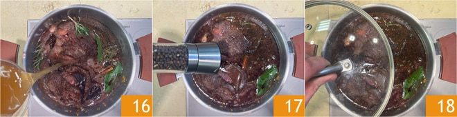 Bedecken Sie mit der heißen Brühe 16, salzen und pfeffern Sie 17. Warten Sie, bis es wieder kocht, dann senken Sie die Hitze und kochen Sie es mit geschlossenem Deckel für etwa 3 Stunden 18.