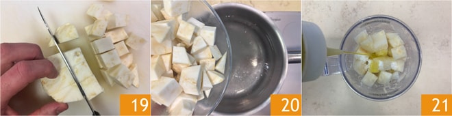 In der Zwischenzeit kümmern Sie sich um die Vorbereitung der Beilage. Schälen Sie die Knollensellerie und schneiden Sie es in Würfel 19, dann kochen Sie es in kochendem Salzwasser für 15-20 Minuten 20. Abseihen und den Knollensellerie in ein Gefäß geben, dann das Öl hinzufügen 21.