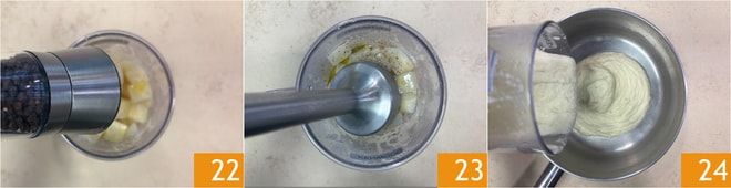 Mit Salz und Pfeffer abschmecken 22, dann mit einem Stabmixer pürieren 23, bis eine glatte und homogene Creme entsteht. Geben Sie sie in einen kleinen Topf und halten Sie sie warm 24.