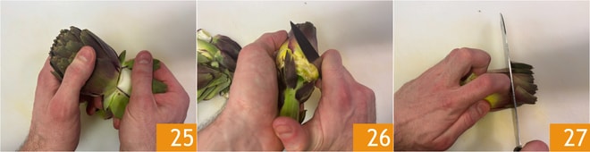 Nun zur Wie man Artischocken putzt: Entfernen Sie die äußeren, härteren Blätter 25, kürzen Sie den Stiel und schälen Sie ihn von der Basis der Artischocke aus 26. Schneiden Sie die Spitzen ab 27.