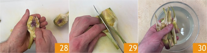 Teilen Sie die Artischocken in Hälften und entfernen Sie das innere Heu 28, dann schneiden Sie sie in Viertel 29 und tauchen sie sofort in gesäuertes Wasser 30.