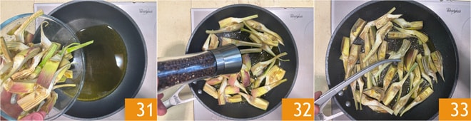 Geben Sie einen Schuss Öl in eine Pfanne, fügen Sie die Artischocken hinzu 31, salzen und pfeffern Sie 32. Braten Sie sie bei mittlerer Hitze für etwa 6-7 Minuten oder bis sie goldbraun sind 33.