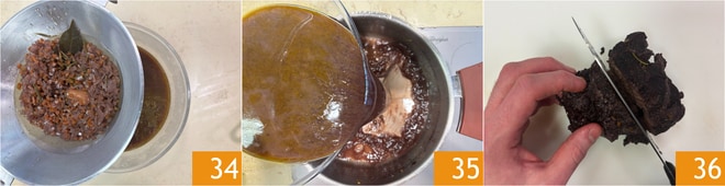 Nach der Garzeit des Fleisches nehmen Sie es aus dem Topf und filtern den Bratensaft 34. Gießen Sie die Flüssigkeit erneut in den Topf 35 und reduzieren Sie sie für etwa 30 Minuten bei mittlerer bis niedriger Hitze; Sie sollten eine Glasur von ausreichender Dichte erhalten, um den Löffel zu bedecken. In der Zwischenzeit schneiden Sie das Fleisch auf 36.