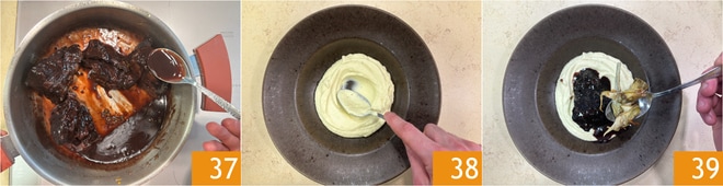 Legen Sie das Fleisch wieder in den Topf und begießen Sie es mit der Glasur 37. Richten Sie das Gericht an, indem Sie auf den Boden des Tellers ein Bett aus Selleriepüree verteilen 38, dann das Fleisch darauflegen und die Artischocken ringsum hinzufügen 39.