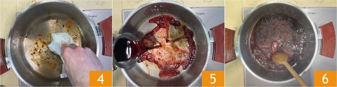 Nehmen Sie das Fleisch aus dem Topf und reinigen Sie den Boden mit Küchenpapier 4, dann gießen Sie ein Glas Wein aus der Gesamtdosis ein 5 und deglacieren Sie den Boden 6. Bewahren Sie den Bratensaft auf.
