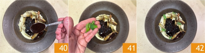 Begießen Sie das Fleisch mit einem Löffel der Glasur 40 und vervollständigen Sie das Gericht mit frischen Minzblättern 41. Ihre Rinderbacke mit Artischocken ist servierfertig 42!