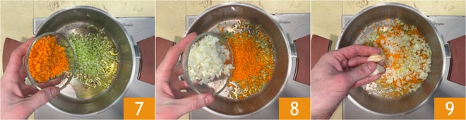 In demselben Topf erhitzen Sie einen weiteren Schuss Öl, dann fügen Sie den fein gehackten Sellerie, die Karotte 7 und die Zwiebel 8 hinzu. Geben Sie auch die Knoblauchzehen in der Schale hinzu 9 und braten Sie bei mittlerer Hitze für einige Minuten, bis das Gemüse weich ist.