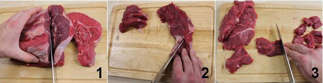 Um das Guinness-Ragout zuzubereiten, nehmen Sie ein großes Stück Fleisch und schneiden es in etwa 2 cm dicke Scheiben 1, entfernen Sie die Fettstücke 2 und schneiden Sie es weiter in etwa 2 cm große Würfel 3.