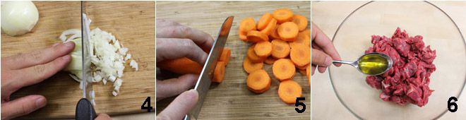 Reinigen und schälen Sie die Zwiebeln und hacken Sie sie grob 4, reinigen und schälen Sie die Karotten und schneiden Sie sie in etwa 0,5 cm dicke Scheiben 5. Geben Sie das Fleisch in eine große Schüssel und fügen Sie 2 Esslöffel Öl hinzu 6