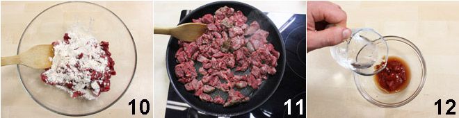 und vermengen Sie alles gut, damit das gesamte Fleisch gut das Öl aufnimmt 7. In einer anderen Schüssel geben Sie das gesiebte Mehl zusammen mit Salz, Pfeffer und Paprika 8. Fügen Sie das gewürzte Mehl dem Fleisch hinzu und vermengen Sie gut, sodass das gesamte Fleisch bemehlt ist (9-10).