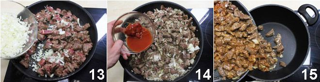 Dann erhitzen Sie ein paar Esslöffel Öl in einem beschichteten Topf, sobald das Öl heiß ist, geben Sie das Fleisch hinzu und braten es mindestens 15 Minuten bei starker Hitze an, indem Sie es gelegentlich wenden 11. Lösen Sie das Tomatenmark in etwa 100 ml heißem Wasser auf 12.