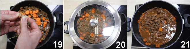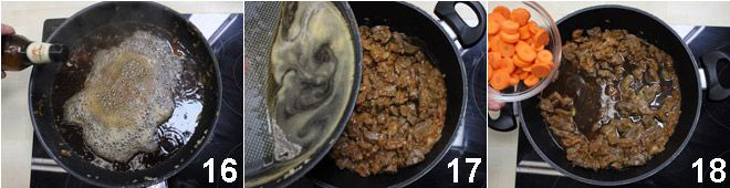 und gießen das Guinness in den Topf, in dem Sie zuvor das Fleisch angebraten haben, dieser Vorgang sorgt dafür, dass das Bier alle Aromen aufnimmt, die sich beim Anbraten des Fleisches gebildet haben, lassen Sie das Bier bei mäßiger Hitze ein paar Minuten verdampfen 16. Gießen Sie die so erhaltene Flüssigkeit zusammen mit dem Fleisch 17 und fügen Sie die Karottenscheiben hinzu 18.