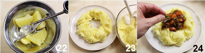 Kochen Sie die Kartoffeln, schälen Sie sie und geben Sie sie noch heiß durch eine Kartoffelpresse, salzen Sie das erhaltene Püree und richten es an, indem Sie einen Ring formen, in den Sie das Guinness-Ragout gießen.