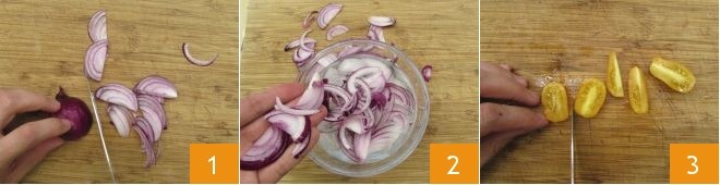 Um den Gurkensalat zuzubereiten, reinigen Sie zuerst die Frühlingszwiebeln und schneiden Sie sie in sehr dünne Scheiben 1, dann legen Sie sie in eine Schüssel mit Wasser und Eis 2: so haben sie einen weniger scharfen Geschmack und bleiben knackig. Waschen und vierteln Sie die gelben Kirschtomaten 3