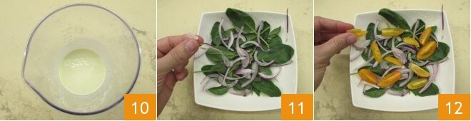 Pürieren Sie mit einem Stabmixer, bis eine glatte und homogene Sauce entsteht 10. Jetzt können Sie den Salat zusammenstellen: Legen Sie die Spinatblätter auf einen Teller, fügen Sie die aus dem Wasser abgetrockneten Schalotten 11 und die bunten Kirschtomaten hinzu 12.