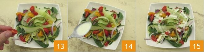 Vervollständigen Sie das Gericht, indem Sie die Gurkenstreifen in Form eines Nestes legen 13 und mit dem Joghurt-Dressing würzen 14: Ihr Gurkensalat ist bereit, genossen zu werden 15!