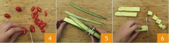 und die roten Kirschtomaten 4. Jetzt waschen Sie die Gurken und schneiden mit einem Gemüseschäler lange, dünne Streifen 5; sobald Sie den kernreicheren Mittelteil erreichen, drehen Sie die Gurke und schneiden Sie auch von der anderen Seite Scheiben ab. Schließlich schneiden Sie den verbleibenden Gurkenkern in Würfel 6. Für den Salat benötigen Sie etwa 100 g Gurkenstreifen und für das Dressing 150 g Gurkenwürfel.