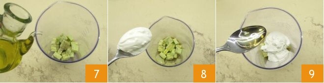 Geben Sie die Gurkenwürfel in einen hohen, schmalen Behälter, salzen und pfeffern Sie, dann fügen Sie das Öl 7, den griechischen Joghurt 8 und den Apfelessig 9 hinzu.