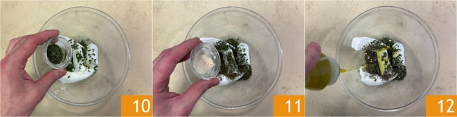 Fügen Sie die getrockneten Kräuter hinzu (Petersilie, Basilikum und Schnittlauch) 10, Knoblauchpulver 11, Salz, Pfeffer und schließlich das Olivenöl extra vergine 12.