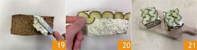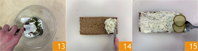 Vermengen Sie alles sorgfältig 13 und fahren Sie mit dem Zusammenstellen des Sandwiches fort: Bestreichen Sie eine Brotscheibe großzügig mit der Kräutercreme 14 und verteilen Sie darauf die Gurkenringe 15.