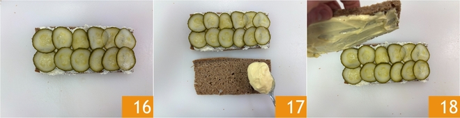 Legen Sie sie nebeneinander, um eine geordnete Schicht zu bilden 16 und bestreichen Sie dann eine weitere Scheibe mit der Mayonnaise 17. Legen Sie diese mit der Mayonnaiseseite nach unten auf die andere 18.