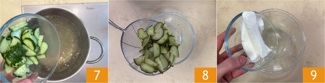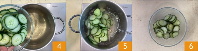 Bringen Sie das Wasser mit Salz und Essig zum Kochen und tauchen Sie die Gurkenscheiben hinein 4. Lassen Sie sie 1-2 Minuten ziehen und schöpfen Sie sie dann ab 5 und legen Sie sie beiseite 6.